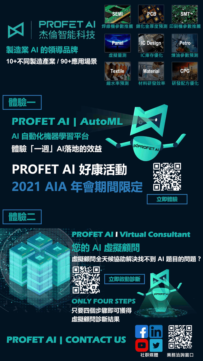 ProfetAI是一間由國際軟體公司與高科技製造業工作多年的專家所組成的軟體公司。我們的使命是打造製造業專屬且一流的端到端AI機器學習自動化解決方案,協助製造業加速數位化與創新。