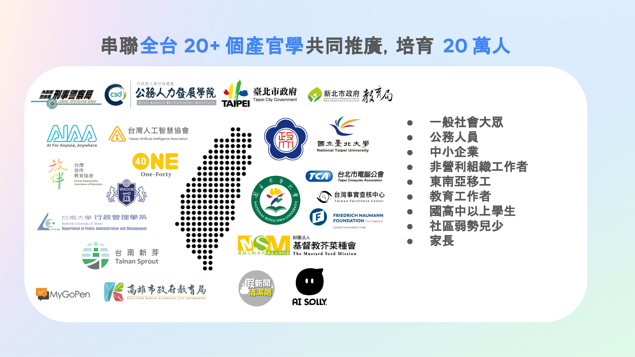 邀請各領域夥伴合作共創在地化課程與學習網絡,讓 AI 素養走入人群、落實民主與責任的 AI 使用。